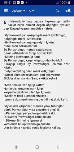 Bu tor beti ziyarǝt ⱪilƣuqilarni uxbu qaƣatay uyƣur tiliƣa tǝrjimǝ ⱪilinƣan Muⱪǝddǝs Kitab, ⱨǝmdǝ bu tǝrjimisining ⱨazirⱪi zaman uyƣur tiliƣa ɵzgǝrtilgǝn nushisi bilǝn tǝminlǝydu. 1950-yilidiki tǝrjimisigǝ asaslanƣan bu uyƣur tilidiki Muⱪǝddǝs Kitab ⱨazirⱪi uyƣur yeziⱪlirida, ⱨǝmdǝ 1965-1982-yillirida ixlitilgǝn «Yengi Yeziⱪ»ta tǝminlinidu.